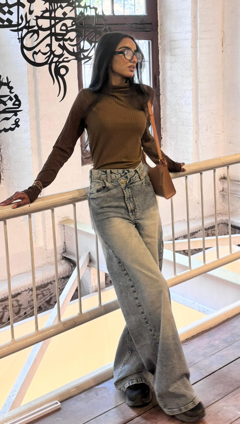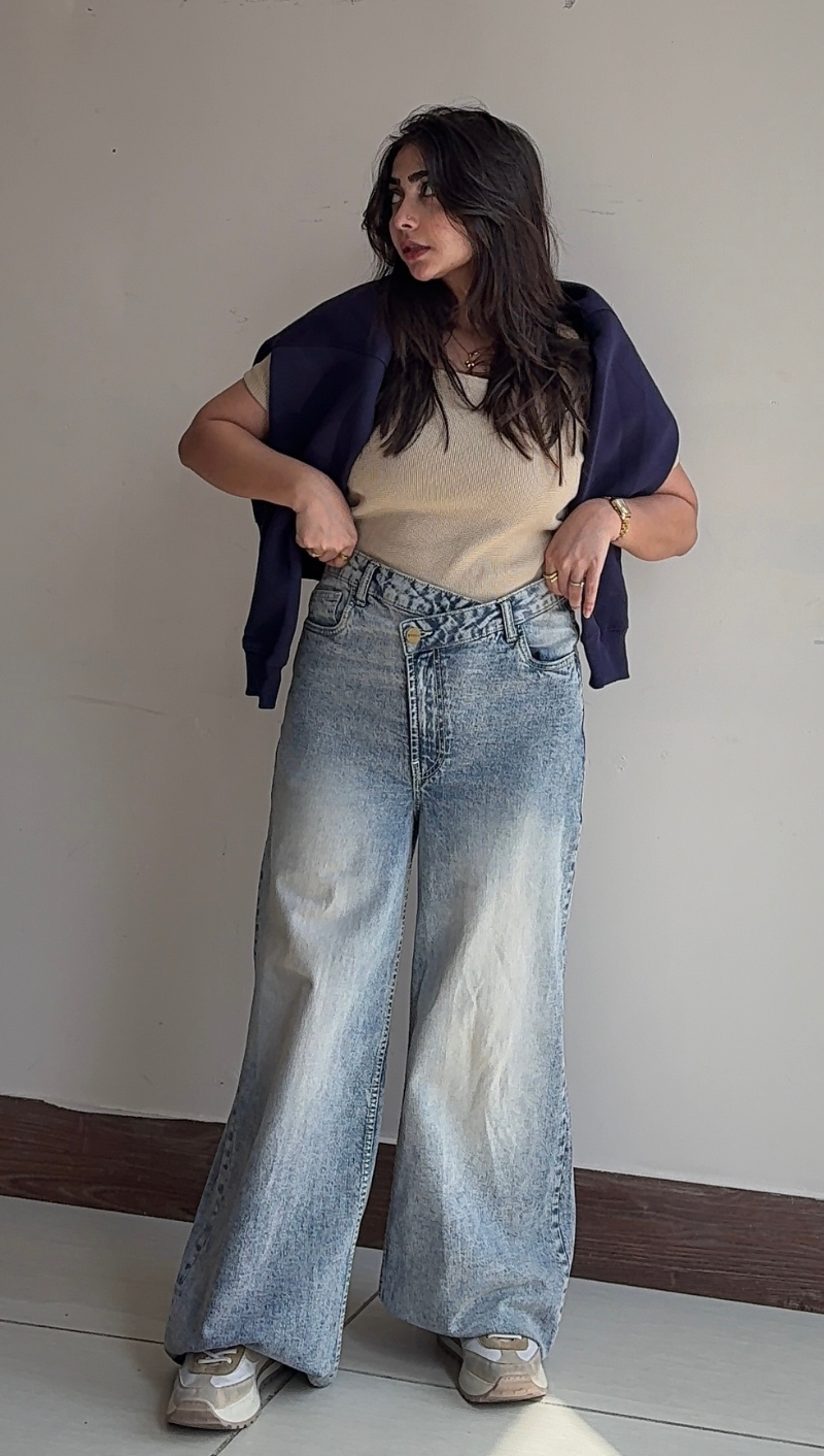 Aria is a deep dark-wash denim crafted with a criss-cross asymmetrical high waist band that adds a modern twist to a timeless classic. Its structured high rise defines the waist, while the sleek silhouette flatters every curve — bold, refined, and effortlessly contemporary