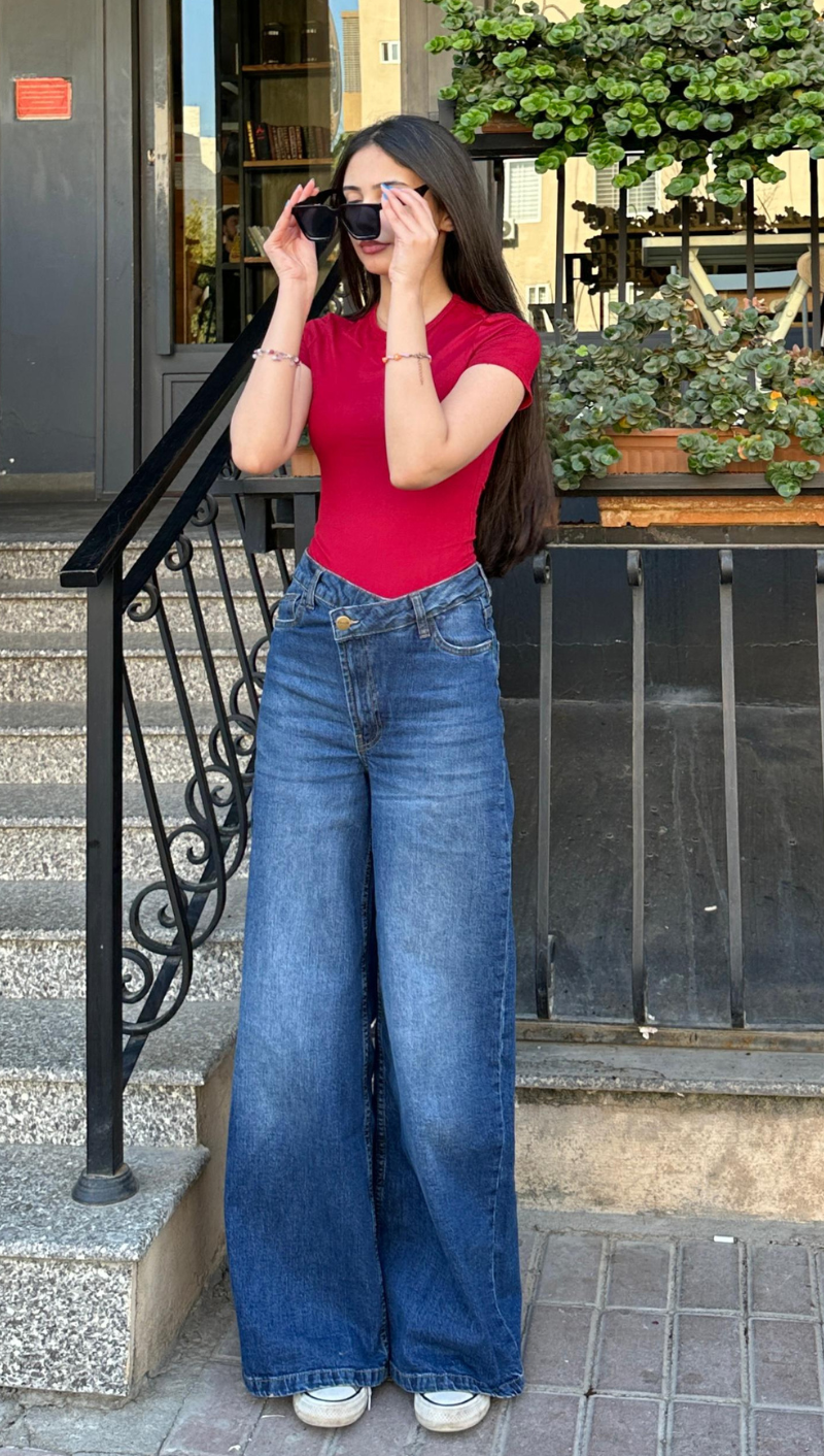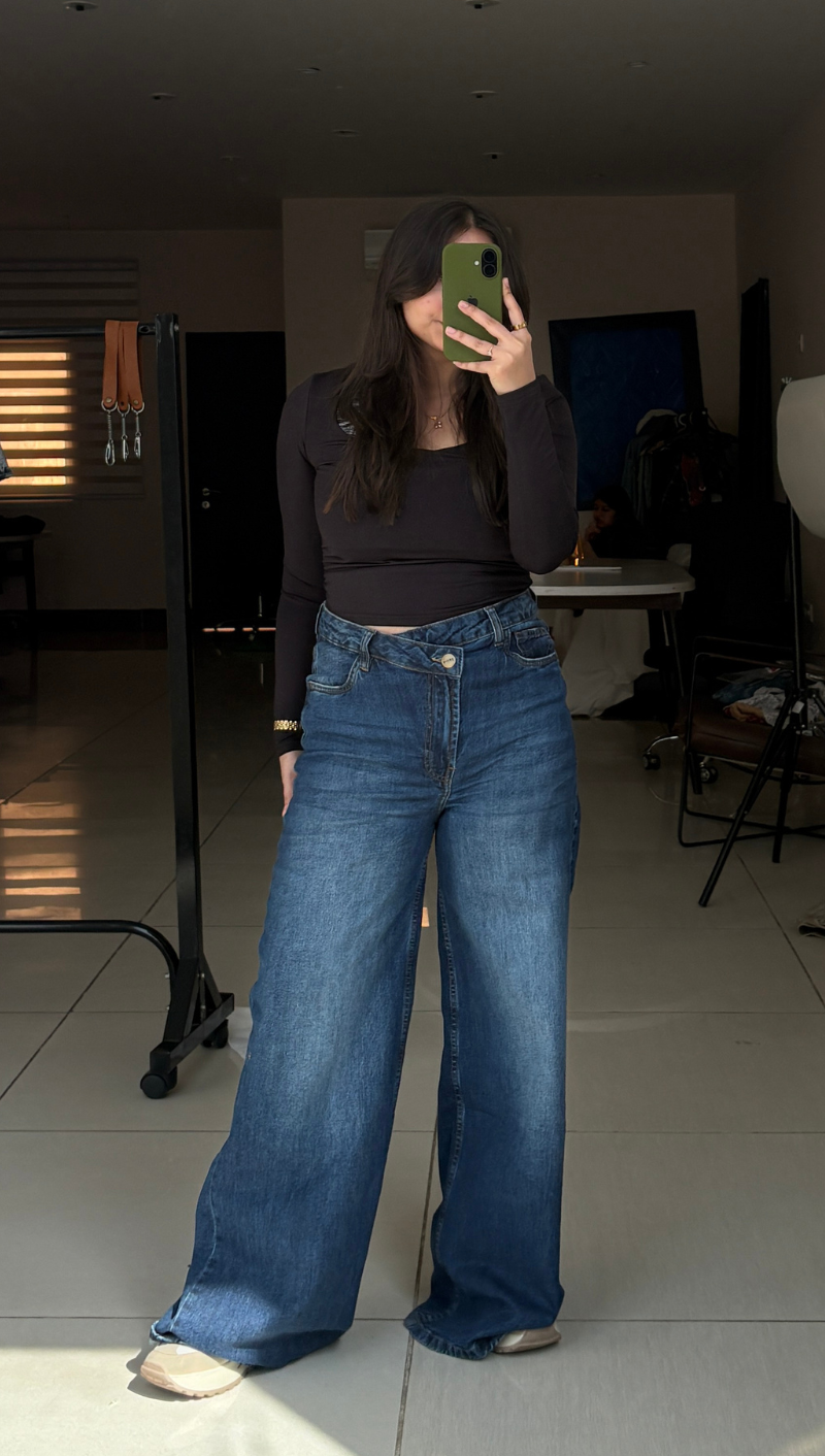 Ava is a deep dark-wash denim crafted with a criss-cross asymmetrical high waist band that adds a modern twist to a timeless classic. Its structured high rise defines the waist, while the sleek silhouette flatters every curve — bold, refined, and effortlessly contemporary