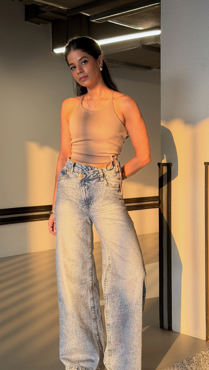 Aria is a deep dark-wash denim crafted with a criss-cross asymmetrical high waist band that adds a modern twist to a timeless classic. Its structured high rise defines the waist, while the sleek silhouette flatters every curve — bold, refined, and effortlessly contemporary