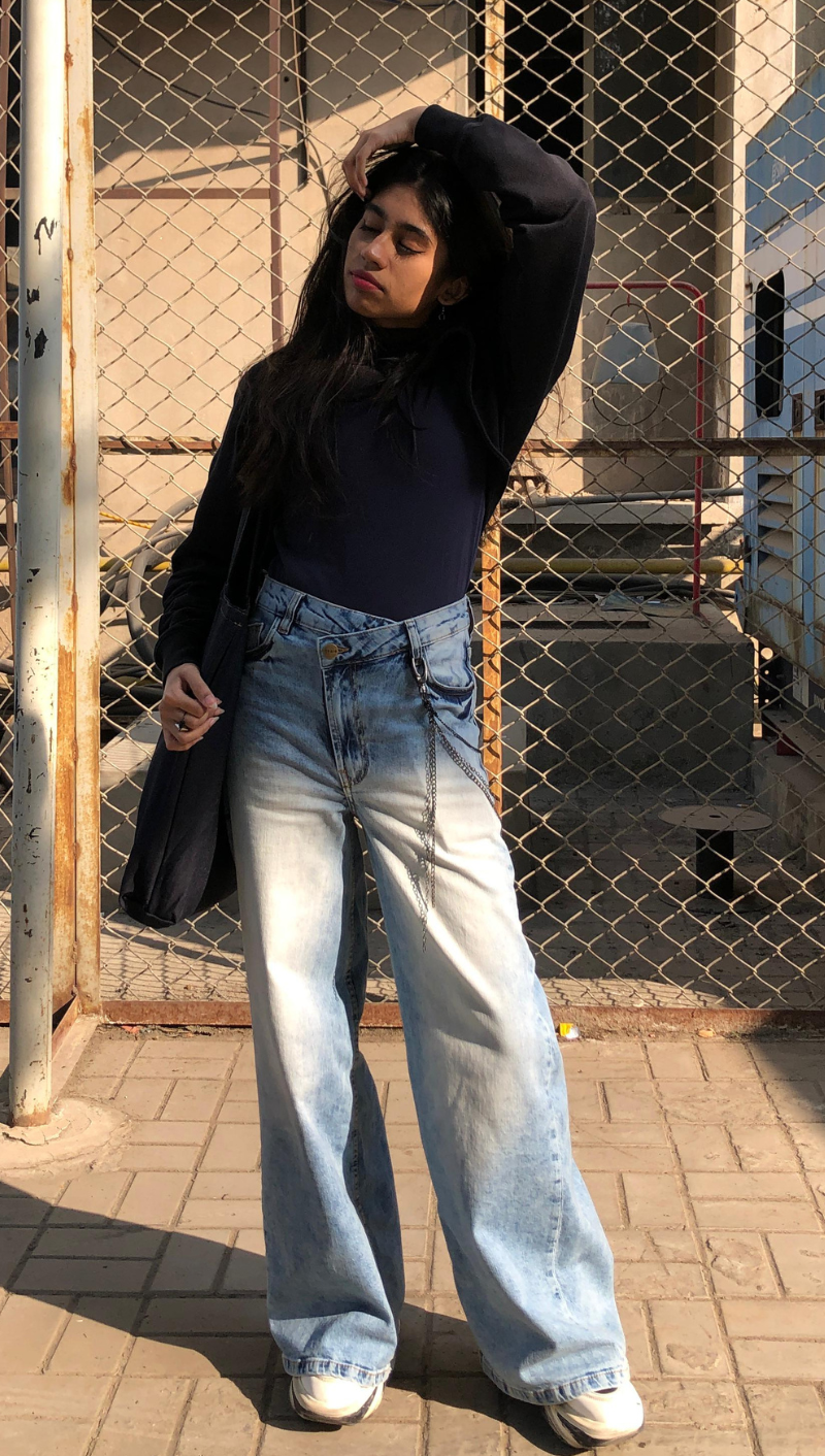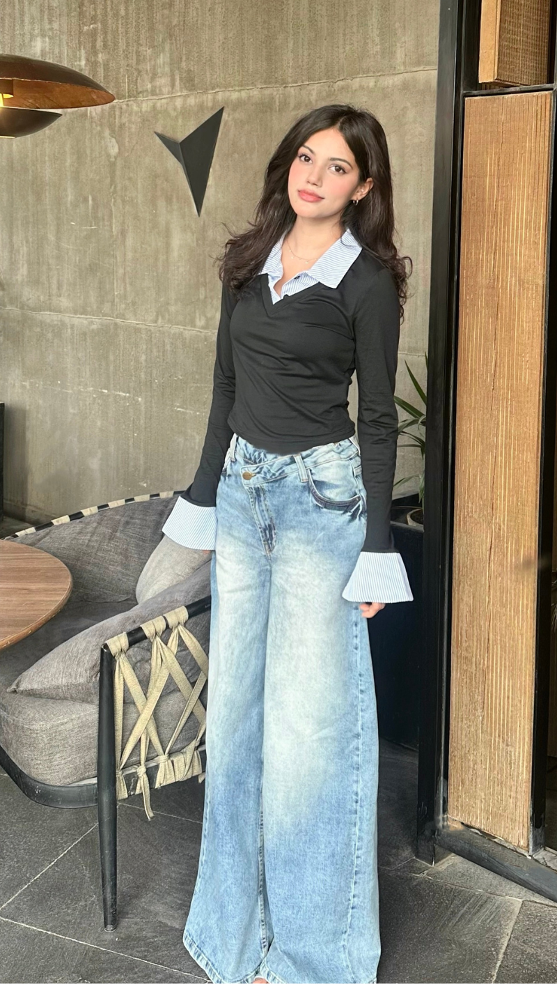 Aviya is a deep dark-wash denim crafted with a criss-cross asymmetrical high waist band that adds a modern twist to a timeless classic. Its structured high rise defines the waist, while the sleek silhouette flatters every curve — bold, refined, and effortlessly contemporary