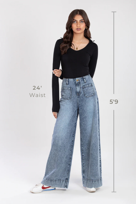 Make a statement with our wide-leg acid wash wide leg pants. Distinctive style, unmatched comfort, and a unique fashion-forward edge.