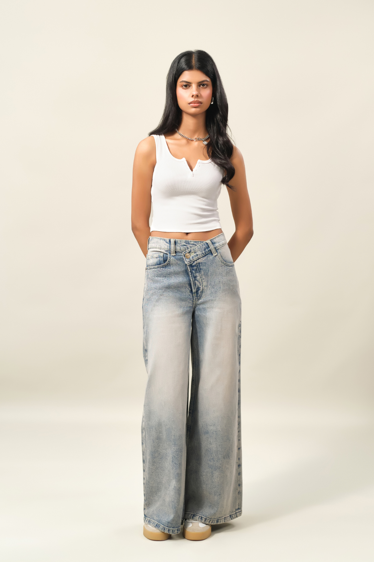 Aria is a deep dark-wash denim crafted with a criss-cross asymmetrical high waist band that adds a modern twist to a timeless classic. Its structured high rise defines the waist, while the sleek silhouette flatters every curve — bold, refined, and effortlessly contemporary