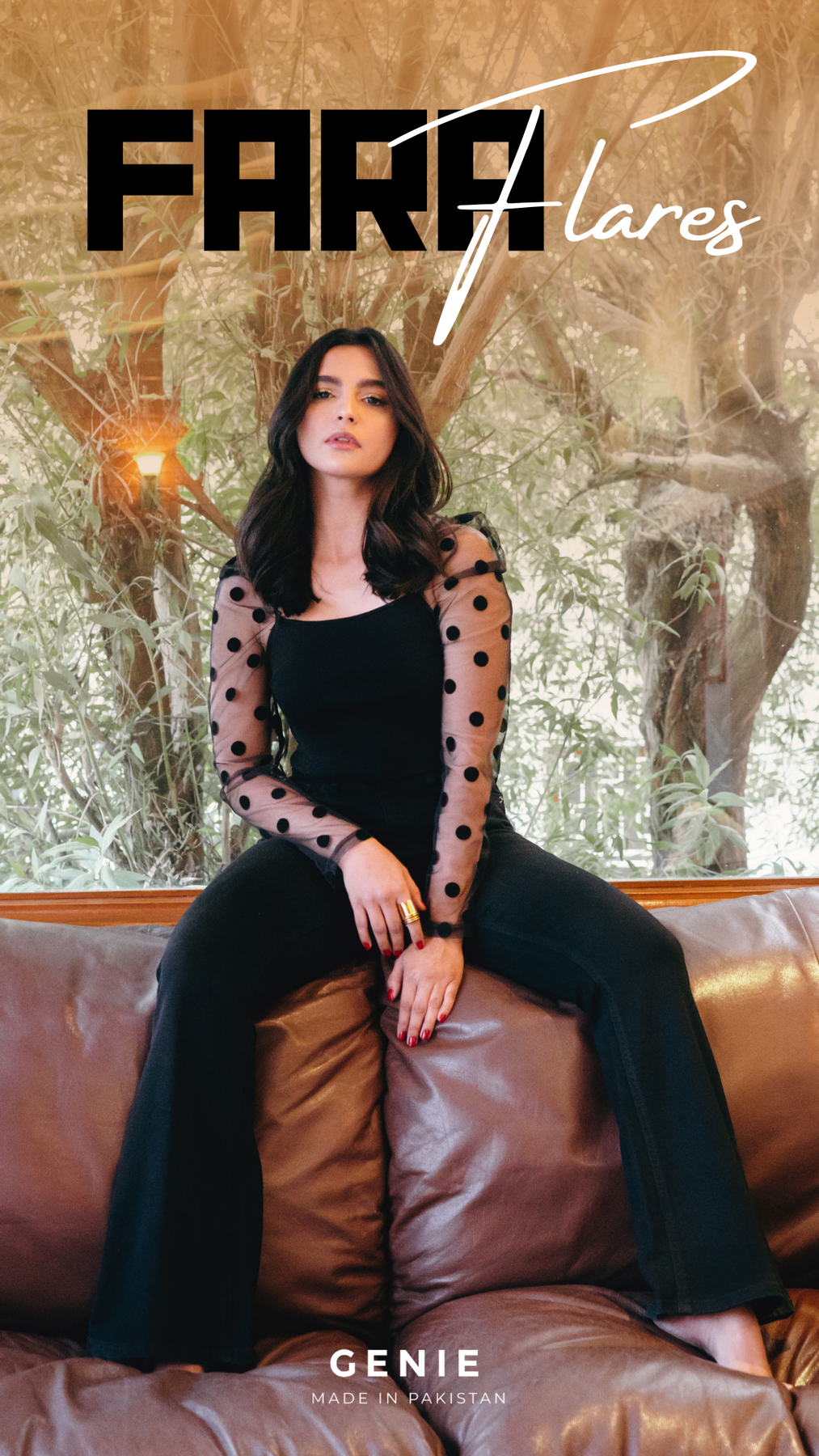 High rise, flared leg jeans in a comfortable black denim- a fashion favourite.