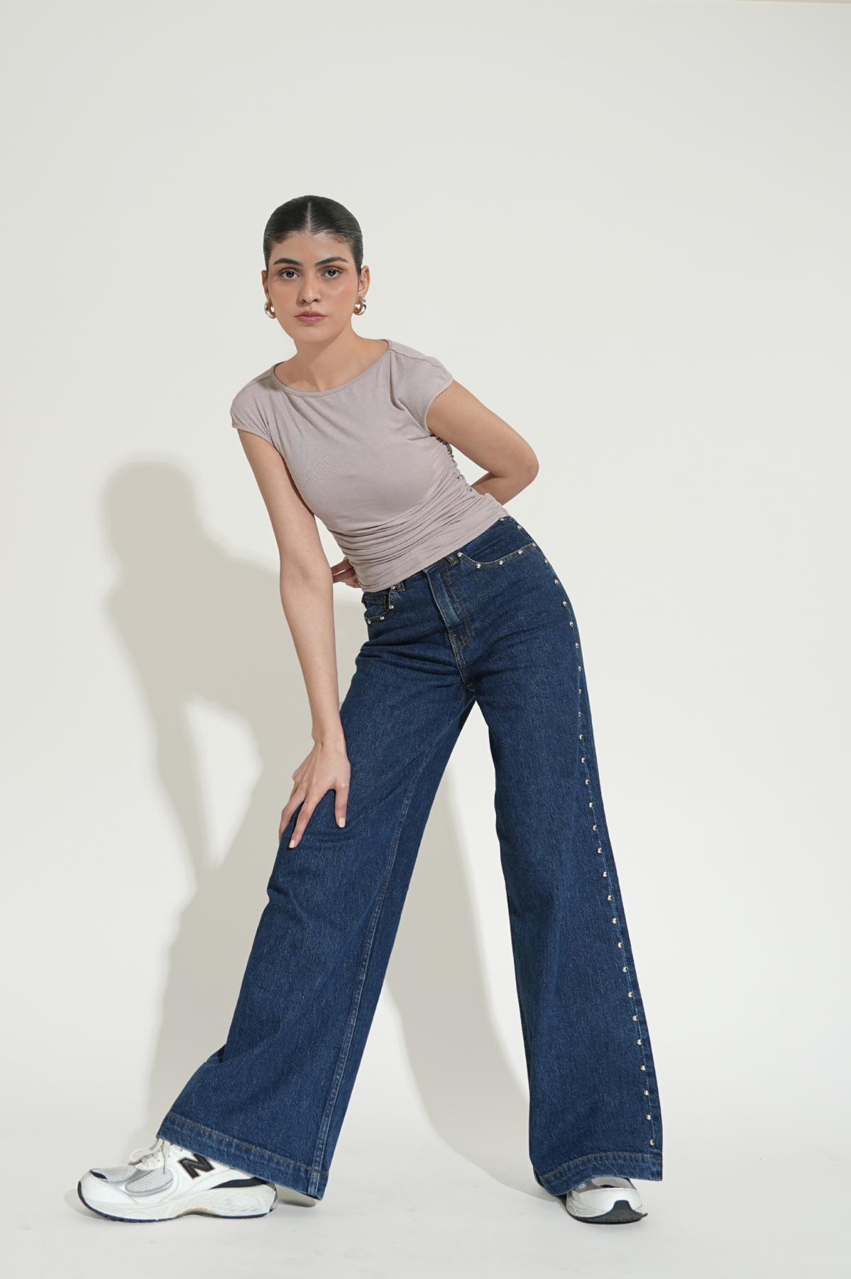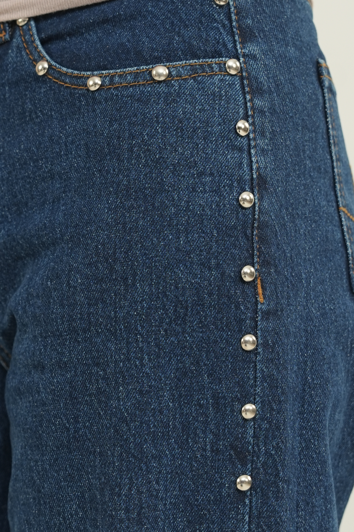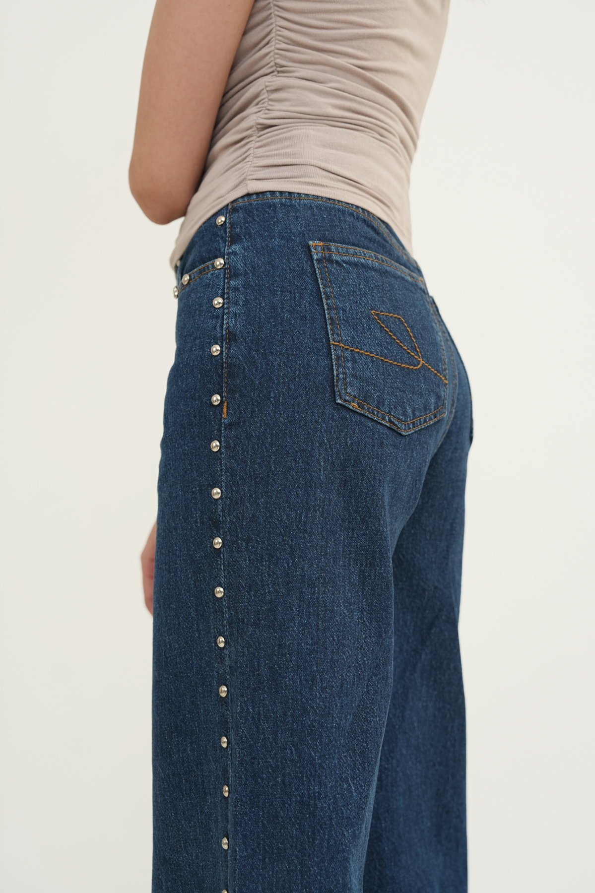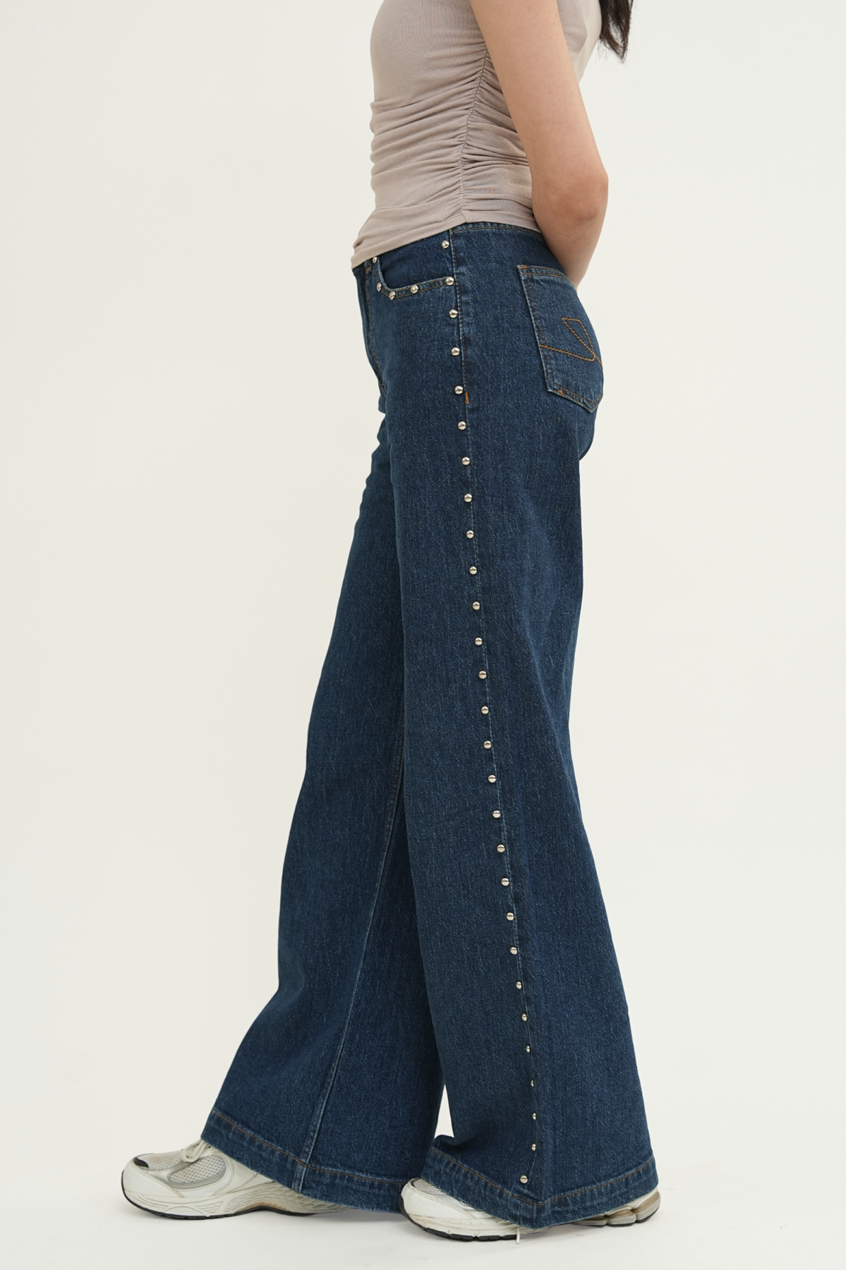 5-pocket wide-leg jeans in comfort denim, designed with a high waist and a zip fly with button closure. The fit sits neatly at the hips before opening into a wide straight leg. Domed metal studs run along the outer sides, adding a bold, edgy detail that elevates the look.