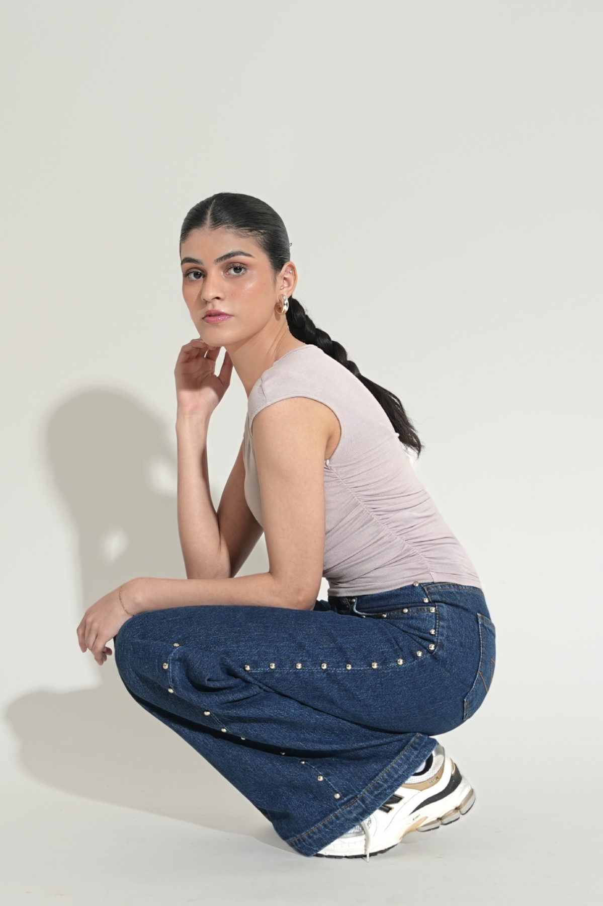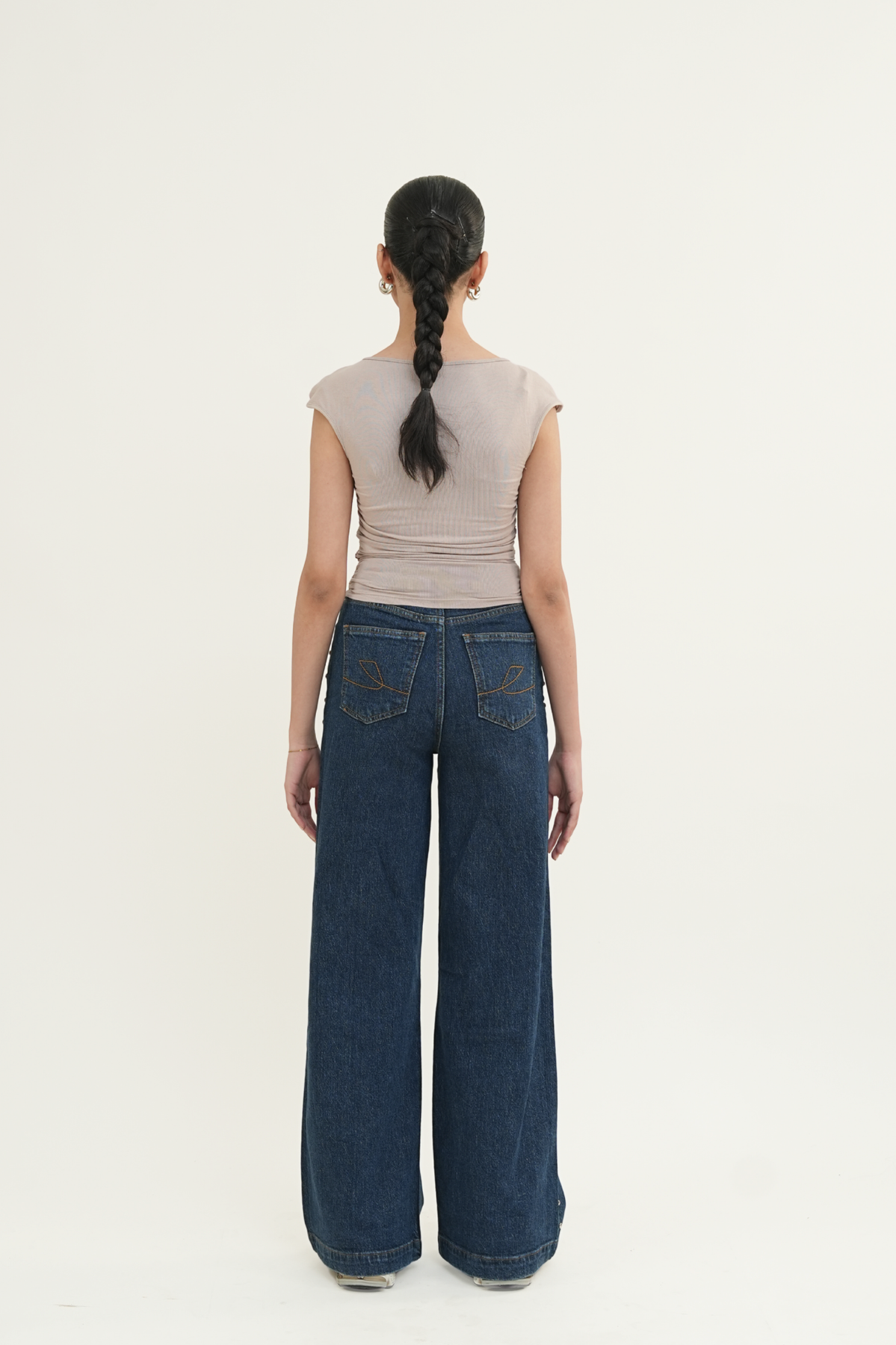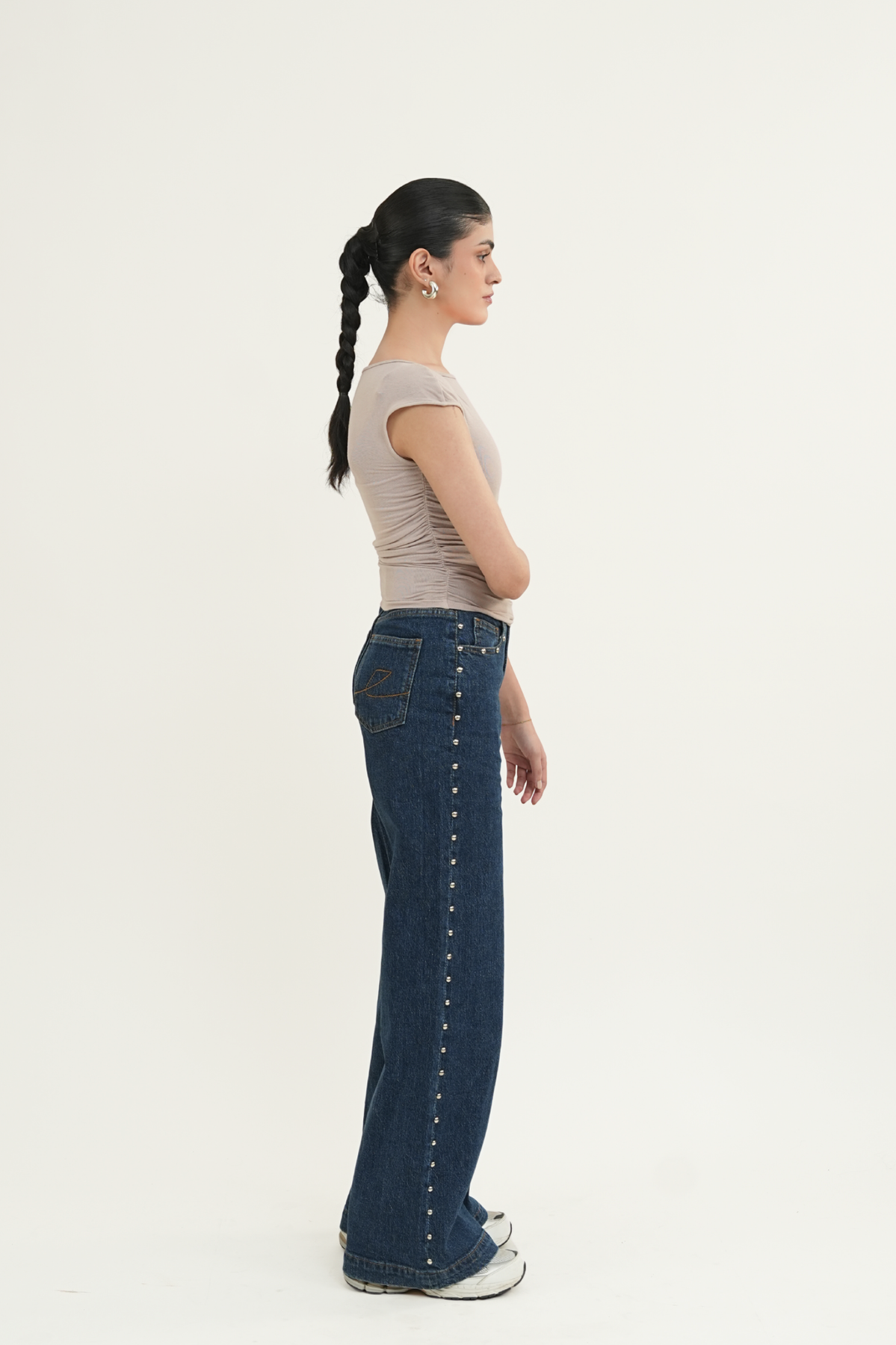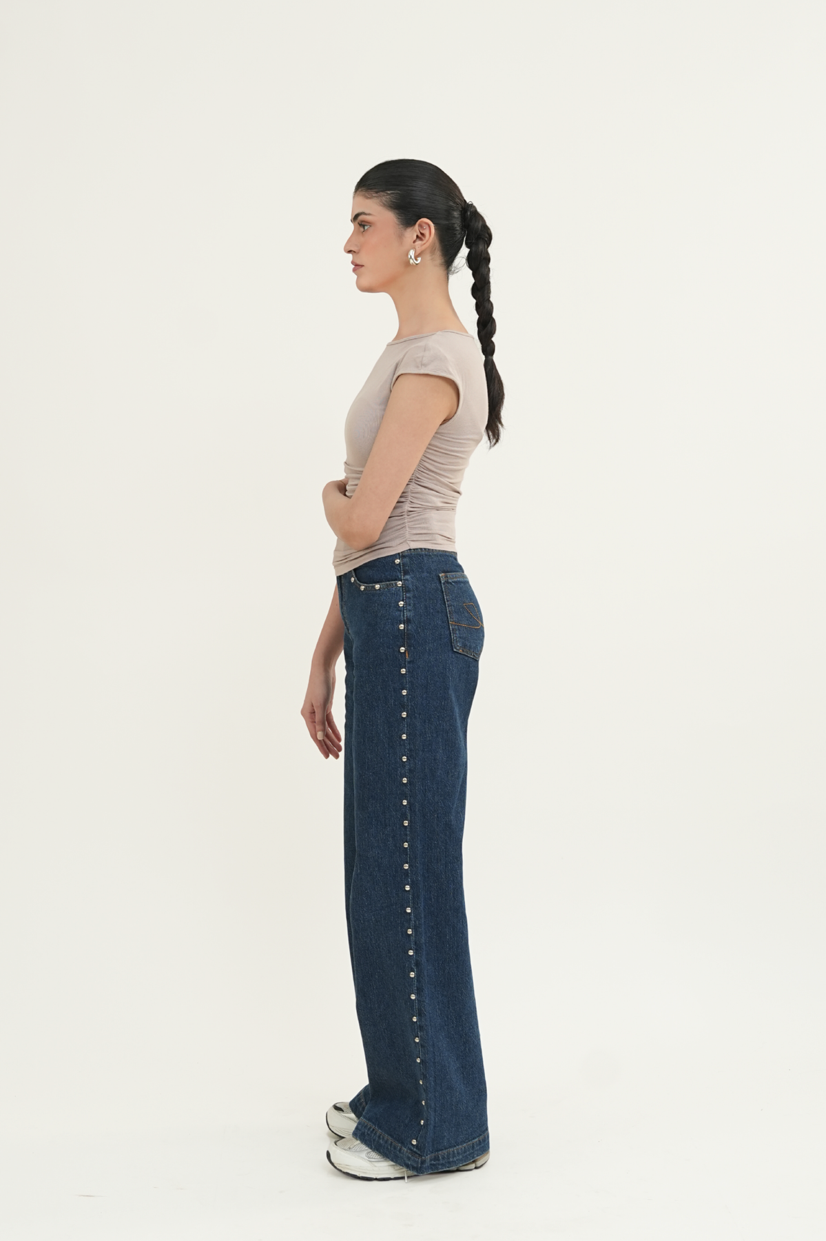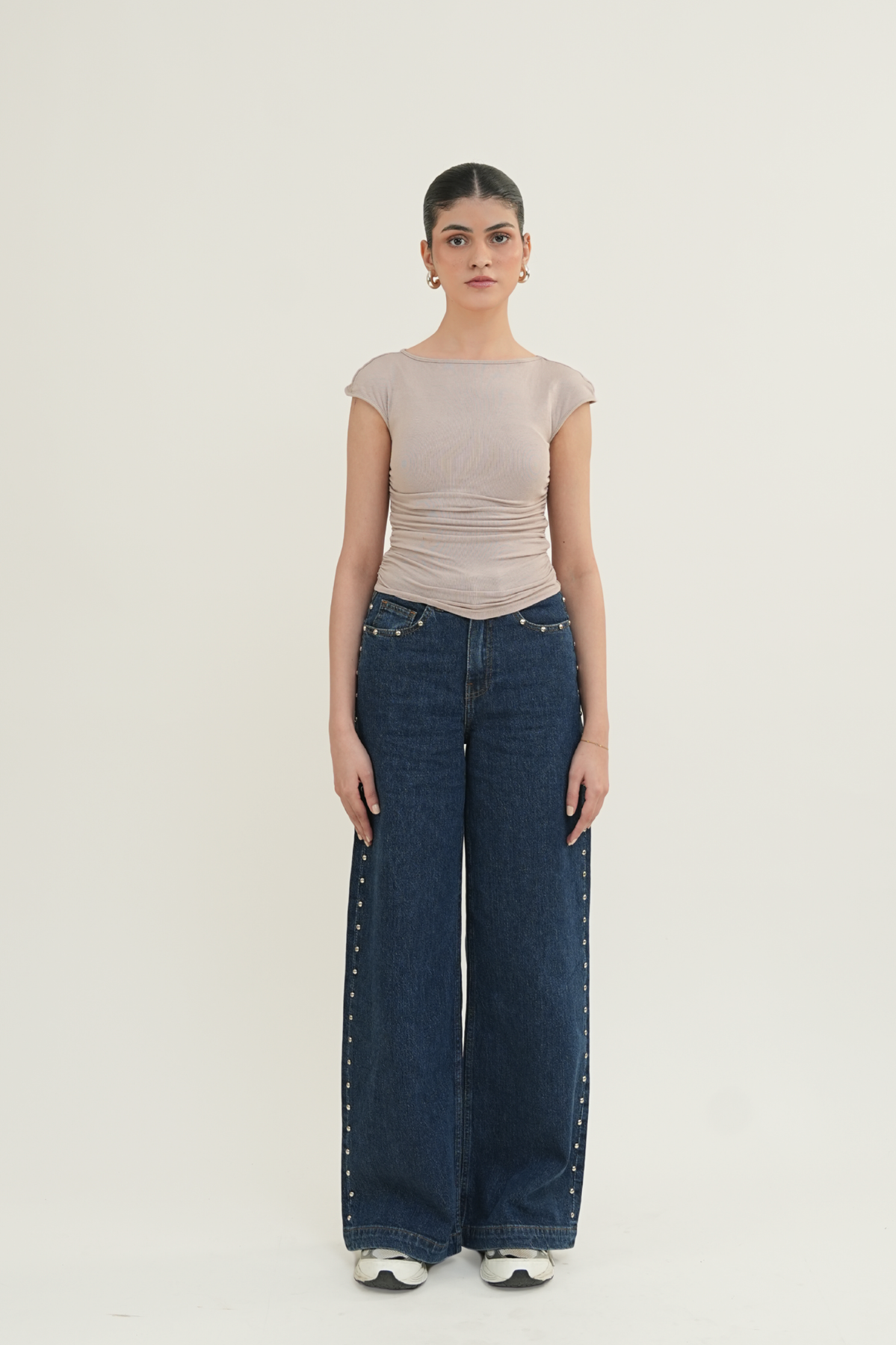 5-pocket wide-leg jeans in comfort denim, designed with a high waist and a zip fly with button closure. The fit sits neatly at the hips before opening into a wide straight leg. Domed metal studs run along the outer sides, adding a bold, edgy detail that elevates the look.